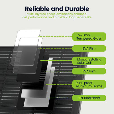 Το 130W All Black Solar Panel προσφέρει μια πλήρη ισχύ εξόδου 130W υπό STC, αυτό το all-black ηλιακό πάνελ συνδυάζει ισχυρή παραγωγή ενέργειας με μια κομψή, ενοποιημένη αισθητική. Το ανθεκτικό μαύρο πλαίσιο 35 mm εξασφαλίζει ανθεκτικότητα έναντι των εξωτερικών στοιχείων και της μηχανικής καταπόνησης, ενώ ο απρόσκοπτος σχεδιασμός black-on-black ενισχύει την οπτική γοητεία χωρίς συμβιβασμούς στην απόδοση. Σχεδιασμένο για να εξισορροπεί την εντυπωσιακή εμφάνιση και την αξιόπιστη ισχύ, είναι ιδανικό για RVs, στέγες κάμπινγκ και οποιαδήποτε εγκατάσταση όπου έχουν σημασία τόσο η απόδοση όσο και η εμφάνιση.